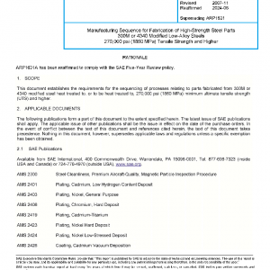 This document establishes the requirements for the sequencing of processes relating to parts fabricated from 300M or 4340 modified steel heat treated to, or to be heat treated to, 270,000 psi (1860 MPa) minimum ultimate tensile strength (UTS) and higher.