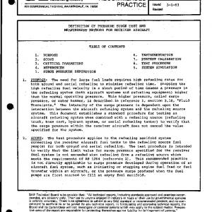 The test procedure applies to the refueling manifold system connecting the receiver aircraft fuel tanks to the refueling source fuel pump(s) for both ground and aerial refueling. The test procedure is intended to verify that the limit value for surge pressure specified for the receiver fuel system is not exceeded when refueling from a refueling source which meets the requirements of AS 1284 (reference 2). This recommended practice is not directly applicable to surge pressure developed during operation of an aircraft fuel system, such as initiating or stopping engine fuel feed or fuel transfer within an aircraft, or the pressure surge produced when the fuel pumps are first started to fill an empty fuel manifold.