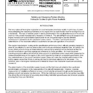 This SAE Aerospace Recommended Practice (ARP) identifies and defines a method of measuring those factors affecting installed power available for helicopter power plants. These factors are installation losses, accessory power extraction, and operation effects. Accurate determination of these factors is vital in the calculation of helicopter performance as described in the flight manual. It is intended that the methods herein prescribe and define each factor as well as an approach to measuring said factor. Only standard installations of turboshaft engines in helicopters are considered. Special arrangements leading to high installation losses, such as the fitting of an infrared suppressor may require individual techniques for the determination and definition of engine installation losses.