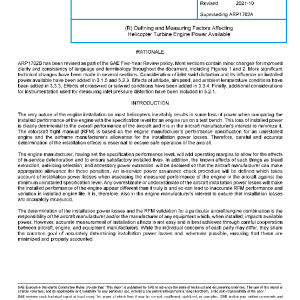 This SAE Aerospace Recommended Practice (ARP) identifies and defines a method of measuring those factors affecting installed power available for helicopter powerplants. These factors are installation losses, accessory power extraction, and operational effects. Accurate determination of these factors is vital in the calculation of helicopter performance as described in the RFM. It is intended that the methods presented herein prescribe and define each factor as well as an approach to measuring said factor. Only basic installations of turboshaft engines in helicopters are considered. Although the methods described may apply in principle to other configurations that lead to more complex installation losses, such as an inlet particle separator, inlet barrier filter (with or without a bypass system), or infrared suppressor, specialized or individual techniques may be required in these cases for the determination and definition of engine installation losses. Some rotorcraft may use an alternate source of propulsion system power to supplement engine output shaft power delivered. If RFM performance includes the contribution of a Supplemental Power Unit (SPU), then the installed power available of the SPU should also be defined and measured, for which the power loss factors and methods described in this document may be applicable.
