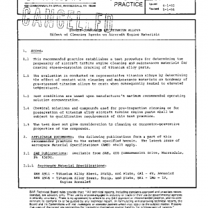 This document establishes a test procedure for determining the propensity of aircraft turbine engine cleaning and maintenance materials for causing stress-corrosion cracking of titanium alloy parts. The evaluation is conducted on representative titanium alloys by determining the effect of contact with cleaning and maintenance materials on tendency of pre-stressed titanium alloys to crack when subsequently heated to elevated temperatures.