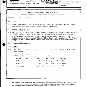 This recommended practice describes an industrial battery, lead acid type, for use in electric powered ground support equipment.