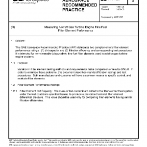 This SAE Aerospace Recommended Practice (ARP) delineates two complementary filter element performance ratings: (1) dirt capacity, and (2) filtration efficiency, and corresponding test procedures. It is intended for non-cleanable (disposable), fine fuel filter elements used in aviation gas turbine engine systems.