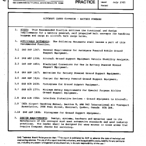 This Recommended Practice outlines the functional and design requirements for a battery powered, self propelled belt conveyor for handling baggage and cargo at aircraft bulk cargo holds.