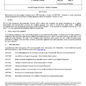 This SAE Aerospace Recommended Practice (ARP) outlines the functional and design requirements for a battery powered, self-propelled belt conveyor for handling baggage and cargo at aircraft bulk cargo holds. Additional considerations and requirements may legally apply in other countries. As an example, for operation in Europe (E.U. and E.F.T.A.), the applicable EN standards shall be complied with.