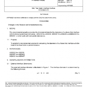 This recommended practice provides the dimensional data for the diameters of surfaces that interface with the following tee head bolt series: AS3232 thru AS3235, MS9397 thru MS9402 and MS9432 thru MS9437, or other parts with compatible dimensions.