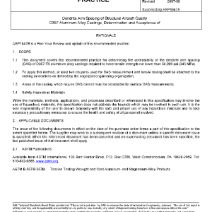 This document covers the recommended practice for determining the acceptability of the dendrite arm spacing (DAS) of D357-T6 aluminum alloy castings required to have tensile strength not lower than 50,000 psi (345 MPa).