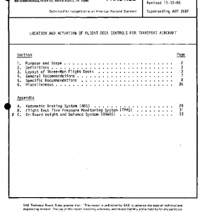 The purpose of this document is to set forth the recommendations of SAE Committee S-7 relative to the location and actuation of flight deck controls. These recommendations are intended to minimize confusion and distraction and thereby reduce transition training time, crew errors, fatigue, and other factors detrimental to flight safety and efficiency. In arriving at these recommendations, the committee carefully reviewed the work of the flight deck layout panel of the Aircraft Committee of the Munitions Board, the recommendations and requirements of the Civil Aeronautics Board, the Federal Aviation Agency, the requirements of the airline operators, the aircraft manufacturers, etc. In cases where conflicting opinions existed, suitable compromises were made. The recommendations of this document apply to commercial type, multi-engine transport aircraft which utilize reciprocating or turbine type powerplants and which are operated in subsonic, transonic, or supersonic speed regimes. These recommendations are not intended to apply to V/STOL configurations.