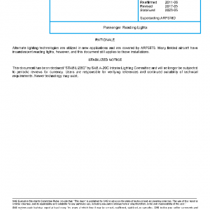 This document presents criteria for design and location of passenger reading lights in commercial aircraft. For LED reading light requirements, see ARP5873, titled: LED Passenger Reading Light Assembly.
