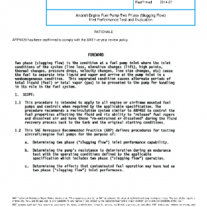 This procedure is intended to apply to all engine or airframe mounted fuel pumps and controls when required by the applicable specification. The procedure recommends a recirculation system similar to ARP492 to control the fuel properties affecting the fluid and its ability to “release” fuel vapors and dissolved air and have these “re-entrained or dissolved” during the fluid recovery process back to the tank and the original starting conditions.