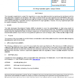 This SAE Aerospace Recommend Practice (ARP) is intended to cover the external lights on fixed wing aircraft for illuminating the wing leading edge and engine nacelles and the upper surfaces of the wing. The addition of an ice detection system should be implemented when the areas to inspect are not visible from the aircraft cockpit. It is not intended that this recommended practice require the use of any particular light source such as halogen, LED, or other specific design of lamp.