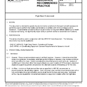 This document is intended to specify the environmental conditions for transport aircraft necessary to permit the crew to perform their duties and functions in comfort, with minimum fatigue and no distraction. Environmental conditions should cause no short or long-term effects deleterious to health or physical well-being, nor significantly impair ability to perform normal or abnormal crew functions.