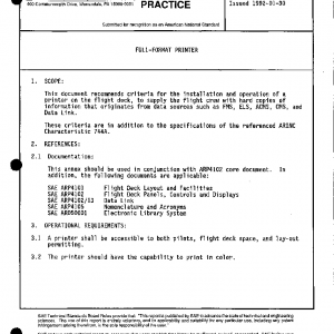 This document recommends criteria for the installation and operation of a printer on the flight deck, to supply the flight crew with hard copies of information that originates from data sources such as FMS, ELS, ACMS, CMS, and Data Link.