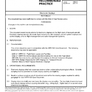 This document recommends criteria for electronic displays on the flight deck of transport aircraft. Electronic displays include electronic flight instruments, alert displays, aircraft system displays and control/display units for flight management and radio management systems.