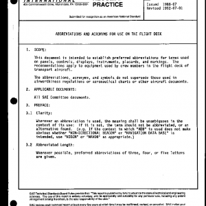 This document is intended to establish preferred abbreviations for terms used on panels, controls, displays, instruments, placards, and markings. The recommendations apply to equipment used by crew members in the flight deck of transport aircraft.