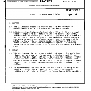 This ARP discusses the desired characteristics of night vision goggle (NVG) filters that can be used with incandescent, electroluminescent (EL) and light emitting diode (LED) light sources to achieve NVG compatible lighting of aerospace crew stations. This ARP also discusses the parameters that need to be considered when selecting a night vision goggle/daylight viewing (NVG/DV) filter for proper contrast enhancement to achieve readability in daylight.