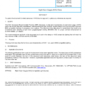 This SAE Aerospace Recommended Practice (ARP) discusses the desired characteristics of night vision goggle (NVG) filters that can be used with incandescent, electroluminescent (EL) and light emitting diode (LED) light sources to achieve NVG compatible lighting of aerospace crew stations. This document also discusses the parameters that need to be considered when selecting a night vision goggle/daylight viewing (NVG/DV) filter for proper contrast enhancement to achieve readability in daylight.