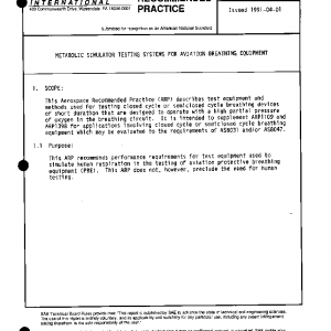 This Aerospace Recommended Practice (ARP) describes test equipment and methods used for testing closed cycle or semi closed cycle breathing devices of short duration that are designed to operate with a high partial pressure of oxygen in the breathing circuit. It is intended to supplement ARP1109 and ARP1398 for applications involving closed cycle or semiclosed cycle breathing equipment which may be evaluated to the requirements of AS8031 and/or AS8047.