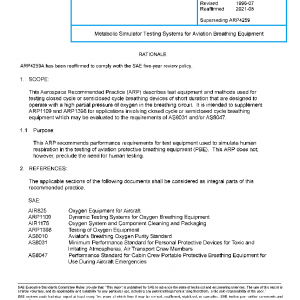 This Aerospace Recommended Practice (ARP) describes test equipment and methods used for testing closed cycle or semiclosed cycle breathing devices of short duration that are designed to operate with a high partial pressure of oxygen in the breathing circuit. It is intended to supplement ARP1109 and ARP1398 for applications involving closed cycle or semiclosed cycle breathing equipment which may be evaluated to the requirements of AS8031 and/or AS8047.
