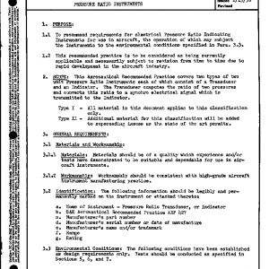 This Aeronautical Recommended Practice covers two types of two unit Pressure Ratio Instruments each of which consist of a Transducer and an Indicator. The Transducer computes the ratio of two pressures and converts this ratio to a synchro electrical signal which is transmitted to the Indicator.