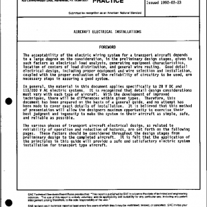 It is the purpose of this document to present design recommendations that will provide a basis for satisfactory and safe electrical wiring installations in transport aircraft. This document is not intended to be a complete electrical installation design handbook. However, the requirements for safety extend so thoroughly throughout the electric systems that few areas of the installation are untouched by the document. It is recognized that individual circumstances may alter the details of any design. It is, therefore, important that this document not be considered mandatory but be used as a guide to good electrical application and installation design.