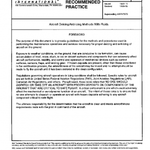 This document establishes the minimum requirements for ground based aircraft deicing/anti-icing with fluids to ensure the safe operation of aircraft during icing conditions. This document does not specify requirements for particular airplane models.