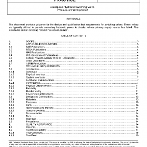 This SAE Aerospace Recommended Practice (ARP) establishes the requirements for the design, manufacture, and qualification of four hydraulic switching valves used in airborne applications. Two are pressure operated, Type IA and IB and two are solenoid/pilot operated, Type IIA and IIB. They are applicable to four pressure classes 3000, 4000, 5000 and 8000 psi. The equipment as designed is intended to be installed in hydraulic systems designed to AS5440 for military applications or ARP4752 and ARP4925 depending on the type of aircraft for commercial applications. Additional or refined requirements shall be contained in the detail (procurement) specification and these shall take precedence over any potentially conflicting requirements of this ARP or documents referenced by this ARP.
