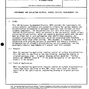 This SAE Aerospace Recommended Practice (ARP) provides the requirements for surface defects, performance and evaluation criteria for various defects and discontinuities encountered in aerospace couplings, tube fittings and hose assembly components. The discontinuities fall into three basic categories: inherent discontinuities, which are present in the raw material stock; primary processing discontinuities, which are caused by processes which work the metal down by either hot or cold deformation into semifinished products; and secondary processing discontinuities, which are associated with finishing operations which occur after rolling. This document is intended to be used in conjunction with existing callouts on government and industry standards. Recommendations of allowable discontinuities are only guidelines, and any government/industry requirements will prevail over this document.