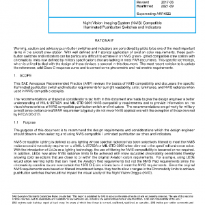 The recommendations and special considerations set forth in this document are made to give the design engineer a better understanding of MIL-L-85762A and MIL-STD-3009 NVIS compatibility requirements and to provide information on the visual characteristics of NVIS compatible pushbutton switch and indicators. The recommendations are primarly for military aircraft since civilian aircraft FAR requirements typically do not cover NVIS applications with the exception of those covered by RTCA/DO-275.