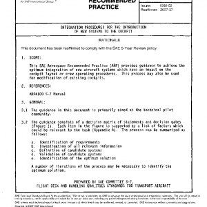 This SAE Aerospace Recommended Practice (ARP) provides guidance to achieve the optimum integration of new aircraft systems which have an impact on the cockpit layout or crew operating procedures. This process may also be used for modification of existing cockpits.