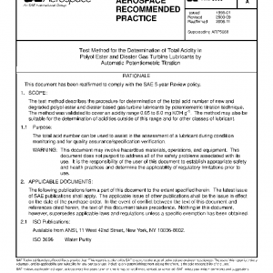 The test method describes the procedure for determination of the total acid number of new and degraded polyol ester and diester based gas turbine lubricants by potentiometric titration technique. The method was validated to cover an acidity range 0.05 to 6.0 mg KOH g-1. The method may also be suitable for the determination of acidities outside of this range and for other classes of lubricant.