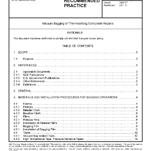 This Aerospace Recommended Practice (ARP) describes methods of vacuum bagging, a process used to apply pressure in adhesive bonding and heat curing of thermosetting epoxy and polyester matrix fabrications for commercial aircraft composite parts. If this document is used for the vacuum bagging of other than thermosetting epoxy and polyester materials, the fitness for this purpose must be determined by the user.