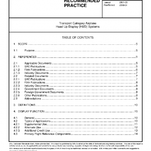 The material provided in this document consists of recommendations related to the design, analysis, testing, and intended functions of head up displays (HUDs) for transport category airplanes. The content of the document is limited to statements of general design and installation considerations, including display function criticality and compliance considerations; symbology, coding, clutter, dimensionality, and attention getting requirements; equipment installation; display visual characteristics; failure modes; information display and formatting; specific integrated display and mode; and system verification.