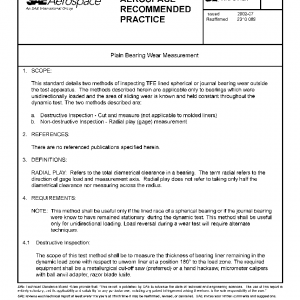 This standard details two methods of inspecting TFE lined spherical or journal bearing wear outside the test apparatus. The methods described herein are applicable only to bearings which were unidirectionally loaded and the area of sliding wear is known and held constant throughout the dynamic test. The two methods described are: