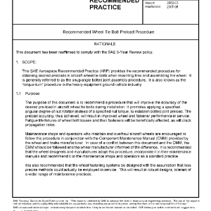This SAE Aerospace Recommended Practice (ARP) provides the recommended procedure for obtaining desired preloads in aircraft wheel tie bolts when mounting tires and assembling the wheel. It is generally referred to as the snug-angle bolted joint assembly procedure. It is also known as the “torque-turn” procedure in the heavy equipment ground vehicle industry.
