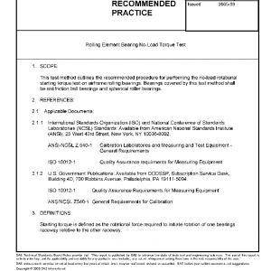 This test method outlines the recommended procedure for performing the no-load rotational starting torque test on airframe rolling bearings. Bearings covered by this test method shall be antifriction ball bearings and spherical roller bearings.