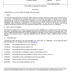 This SAE Aerospace Recommended Practice (ARP) establishes methods for testing airframe rolling element bearings. The purpose of ARP5483 and its associated slash sheets is to document test methods commonly used to evaluate airframe bearings. These test methods may be referenced in standards, purchase orders, etc. when the test is deemed appropriate to the intended use of the bearing by the end user of the bearing. These test methods are not intended to encompass every conceivable requirement for an airframe bearing. The end user of the bearing must exercise engineering judgment to determine the most appropriate standard and/or nonstandard tests for the application.