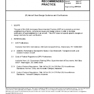 The goal of this SAE Aerospace Recommended Practice (ARP) is to promote a common understanding of terms, compliance issues and design criteria in order to facilitate certification of seat installations in an aircraft. This ARP does not specify specific designs or design methods for such certification.