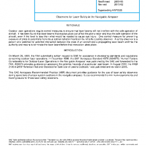 This document applies to safety observers or spotters involved with the use of outdoor laser systems. It may be used in conjunction with SAE Aerospace Standard (AS4970) “Human Factors Considerations for Outdoor Laser Operations in the Navigable Airspace.” Additional control measures may be applicable and are listed in ANSI Z136.6.
