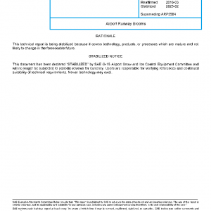This aerospace recommended practice provides definition for Airport Runway Brooms and covers requirements for various configurations of runway brooms with and without a carrier vehicle. Runway brooms are primarily used to move and clear snow and ice down to bare pavement on airport operational areas such as runways, taxiways and ramp areas. The term carrier vehicle represents the various self-propelled prime movers that provide the forward motion of the various configurations of runway brooms.
