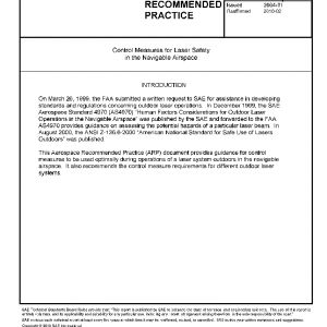 This SAE Aerospace Recommended Practice (ARP) provides information and guidance for the control of hazardous laser energy in the navigable airspace. This document provides guidance to all laser proponents and the FAA on the optimal use of control measures during propagation of a laser beam in the navigable airspace. This document does not cover control measures already set forth in federal, state, and local regulations for the safe operations of lasers. FAA will review control measures in their aeronautical study of proposed outdoor laser operations.