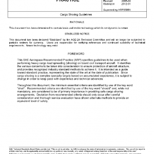 This SAE Aerospace Recommended Practice (ARP) specifies guidelines for calculating and performing shoring (load spreading) required on board civil transport aircraft whenever a piece of cargo to be carried exceeds the aircraft’s maximum allowable limits in area load, running load, or both. It provides both the engineering methods needed to properly design a shoring arrangement, and the main practical dos and donts known from experience to ensure its effectiveness in protecting the aircraft’s structure against overload.