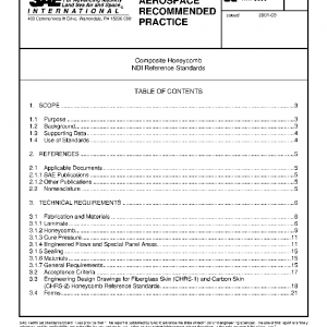 This recommended practice establishes generic reference standards that will accommodate nondestructive inspections (NDI) on a broad range of non-metallic composite honeycomb structures found on aircraft.