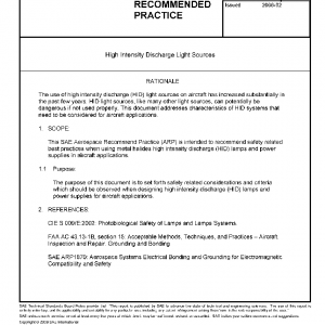 This SAE Aerospace Recommend Practice (ARP) is intended to recommend safety related best practices when using metal halides high intensity discharge (HID) lamps and power supplies in aircraft applications.