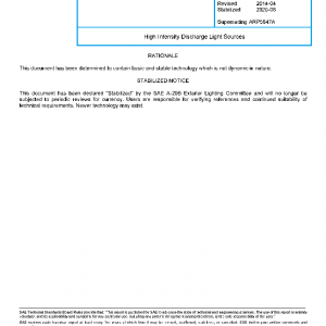 This SAE Aerospace Recommend Practice (ARP) is intended to identify both safety related best practices and unique design considerations of metal halides High Intensity Discharge (HID) lamps and power supplies in aircraft applications.