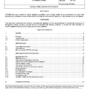 The purpose of this document is to provide guidelines for the standardization of safe operating procedures to be used in performing the services and maintenance at Designated Deicing Facilities (Central Deicing Facilities/Remote Deicing Facilities) that are necessary for proper deicing/anti-icing of aircraft on the ground and performing of associated checks in accordance with the various approved ground icing programs, while considering applicable local environmental, operational and economic requirements.