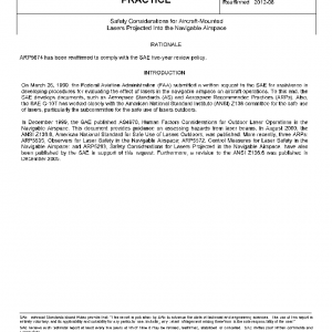 This document is intended to be used for laser systems mounted on aircraft and intended for use in the navigable airspace. This does not include lasers onboard aircraft where the beam is contained within an enclosure so that the beam cannot enter into airspace, nor does it include lasers from satellites and spacecraft in outer space. It may be used in conjunction with: AS4970, ARP5535, ARP5572, ARP5293, and the ANSI Z136 laser safety standards.