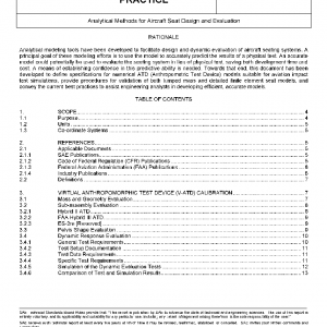 This SAE Aerospace Recommended Practice (ARP) defines a means of assessing the credibility of computer models of aircraft seating systems used to simulate dynamic impact conditions set forth in Federal Regulations 14 CFR Part 23.562, 25.562, 27.562, and 29.562. The ARP is applicable to lumped mass and detailed finite element seat models. This includes specifications and performance criteria for aviation specific virtual anthropomorphic test devices (v-ATDs). A methodology to evaluate the degree of correlation between a seat model and dynamic impact tests is recommended. This ARP also provides testing and modeling best practices specific to support the implementation of analytical models of aircraft seat systems. Supporting information within this document includes procedures for the quantitative comparison of test and simulation results, as well as test reports for data generated to support the development of v-ATDs and a sample report. For this revision, Section 4, Seat System Validation is held in reserve.