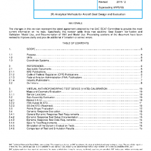 This SAE Aerospace Recommended Practice (ARP) defines a means of assessing the credibility of computer models of aircraft seating systems used to simulate dynamic impact conditions set forth in Federal Regulations §14 CFR Part 23.562, 25.562, 27.562, and 29.562. The ARP is applicable to lumped mass and detailed finite element seat models. This includes specifications and performance criteria for aviation specific virtual anthropomorphic test devices (v-ATDs). A methodology to evaluate the degree of correlation between a seat model and dynamic impact tests is recommended. This ARP also provides testing and modeling best practices specific to support the implementation of analytical models of aircraft seat systems. Supporting information within this document includes procedures for the quantitative comparison of test and simulation results, as well as test reports for data generated to support the development of v-ATDs and a sample v-ATD calibration report.