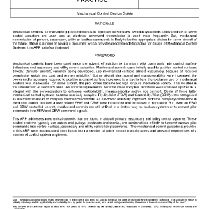 This SAE Aerospace Recommended Practice (ARP) provides guidelines for the configuration and design of mechanical control signal transmission systems and subsystems. It is focused on the recommended practices for designing cable and pulley, pushrod and bellcrank and push-pull flexible cable control systems. These systems are typically used in some combination to transmit pilot commands into primary, secondary and utility control system commands (mechanical or electrical) or aircraft surface commands. On mechanically controlled aircraft, most pilot control commands are initiated through cockpit mounted wheels, sticks, levers, pedals or cranks that are coupled by pushrods or links to cable systems. The cable systems are routed throughout the aircraft and terminated in close proximity to the commanded surface or function where cranks and pushrods are again used to control the commanded function.